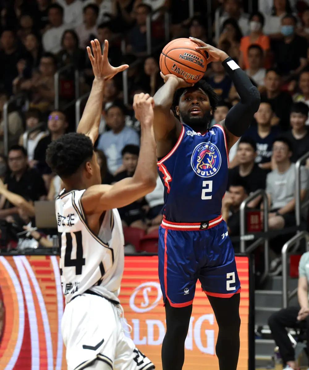 6月25日,香港金牛队球员乔丹·沃克(右)在比赛中投篮。新华社记者 卢炳辉 摄