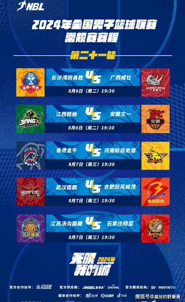 短暂休整期结束后,NBL常规赛烽火重燃。8月6日晚,安徽文一将在赣州客场对阵江西赣驰,长沙湾田勇胜将在主场与广西威壮交锋,8月7日,香港金牛 VS 河南赊店老酒,武汉锟鹏 VS 合肥狂风峻茂,江苏汤沟国藏 VS 石家庄翔蓝,最后6轮常规赛,每一场比赛都需要全力以赴。