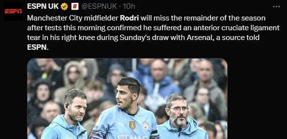 曼城主场2比2与阿森纳的比赛中,核心球员罗德里在第21分钟因受伤退出比赛,情况引起了人们的关注。据著名伤病分析自媒体Physio Scout称,罗德里可能面临前交叉韧带撕裂和半月板损伤,最少需9个月以上才能恢复;西班牙著名运动医学专家Pedro Luis Ripoll也认为,罗德里的伤势严重,可能涉及到关节韧带结构。随后西班牙媒体爆料,初步扫描和检查显示右膝盖十字韧带撕裂,这也被ESPN、TA和英格兰媒体卫报证实,意味着罗德里本赛季无法再出场。